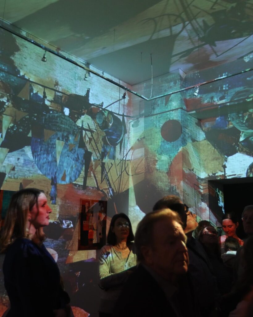 Transcendence was conceived as a living triptych, bringing together projection, music, and painting in a seamless sensory blend. Through multiple 360-degree projectors, visitors were enveloped in a dynamic display of moving images that interacted with Quercy’s paintings, bringing his vibrant canvases to life. The projections incorporated elements of his artwork, creating an immersive journey that invited viewers to delve into themes of human longing: faith, love, and hope. The audience found themselves surrounded by vivid colors, shapes, and music, creating an experience that transcended traditional exhibition formats.